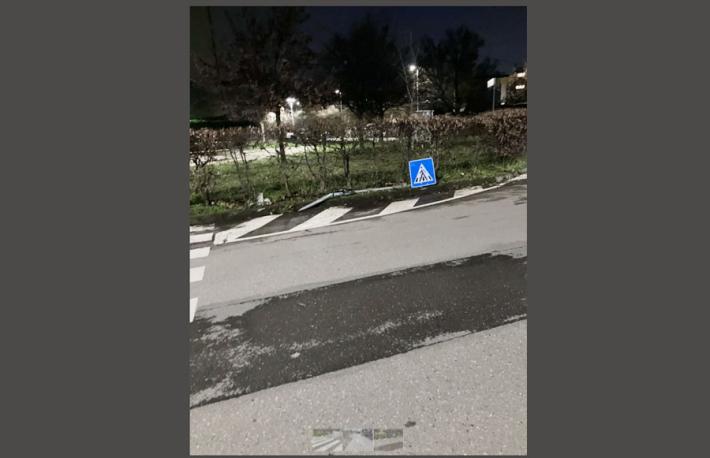 Il lettore Francesco Galloni ha inviato la foto del cartello dell'attraversamento pedonale in strada Naviglio alto in concomitanza dell'area verde divelto per l'ennesima volta.