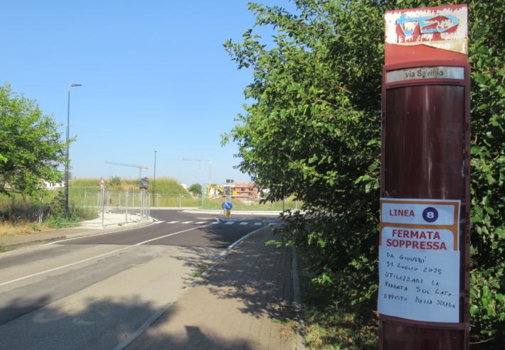 Un avviso sul vecchio capolinea di via Savinio invita a prendere il bus alla fermata sul lato opposto (posizionata vicina a via Marconi) per salire sull’autobus diretto al capolinea che, dopo qualche minuto di sosta, riparte per il centro