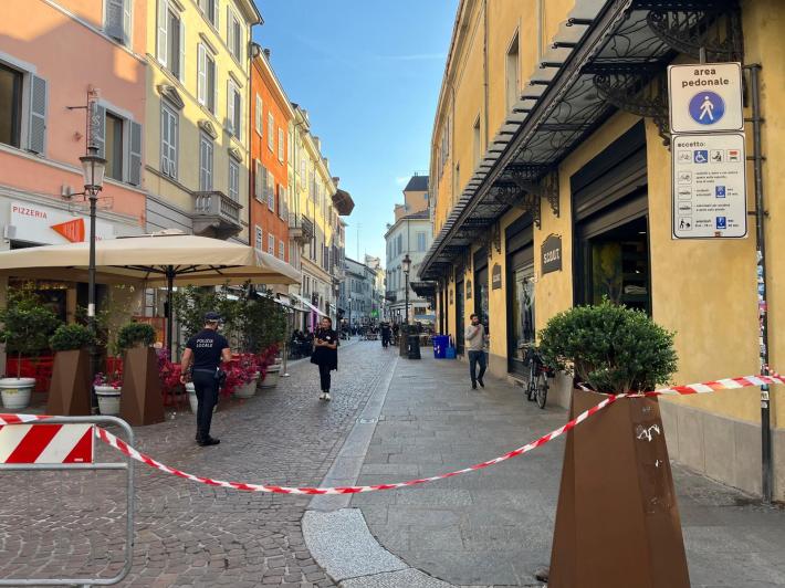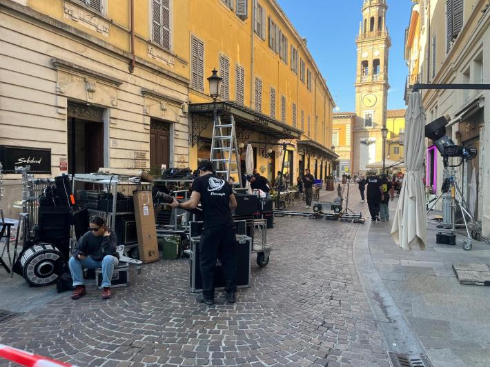 La parte finale di via Cavour, nel cuore di Parma, per un giorno transennata. Tanta curiosità, anche se la presenza di telecamere, cavi e luci risolve presto in gran parte la domanda di cosa stesse succedendo. Nel dettaglio, stanno girando uno spot per Acqua di Parma all'interno del Caffé Cavour.