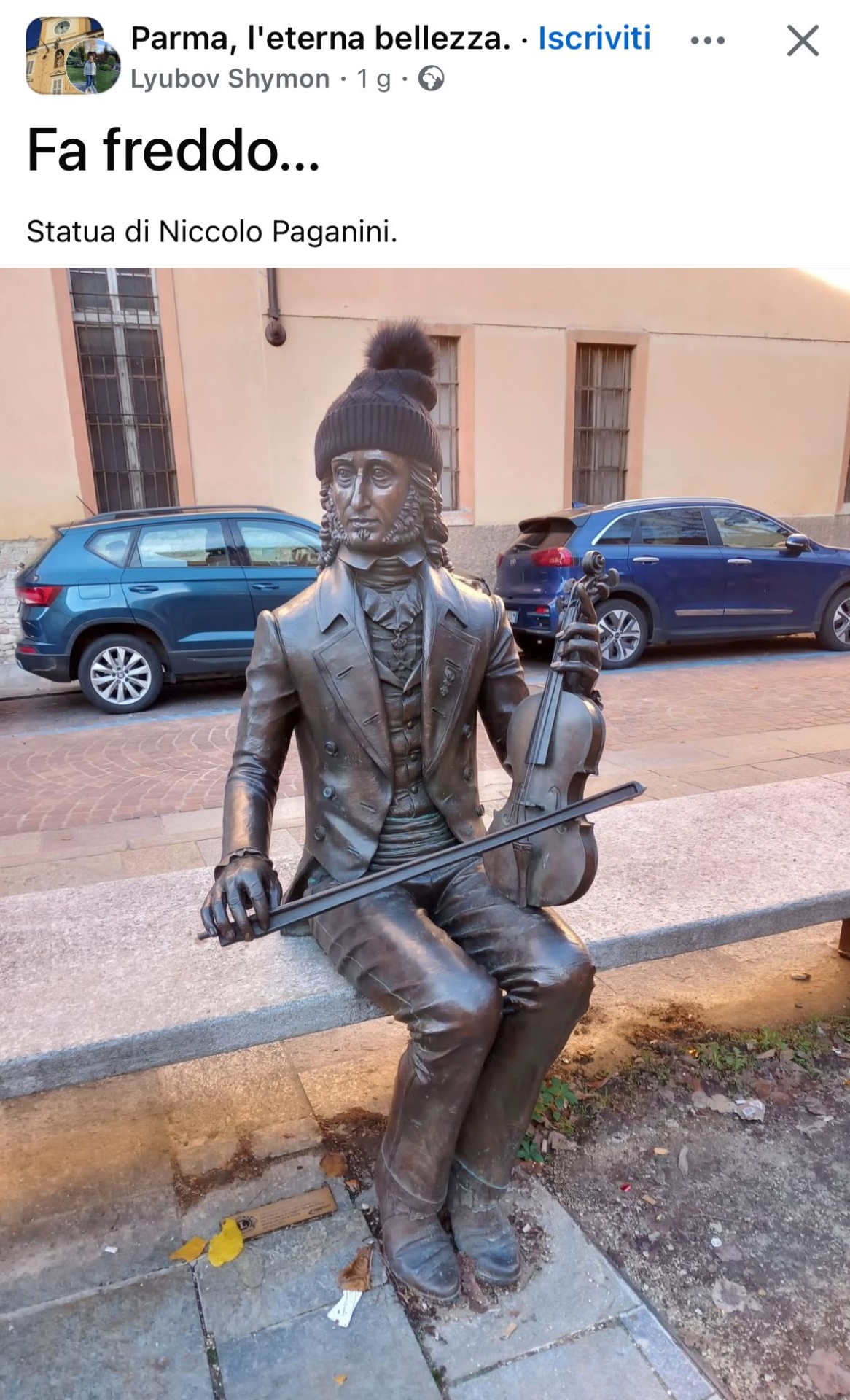 Anche la statua di Paganini...ha freddo. La simpatica foto è stata postata dalla pagina Facebook "Parma, l'eterna bellezza" e mostra come qualcuno, per scherzare, abbia deciso di mettere un cappello di lana alla statua del grande compositore in piazzale Boito.