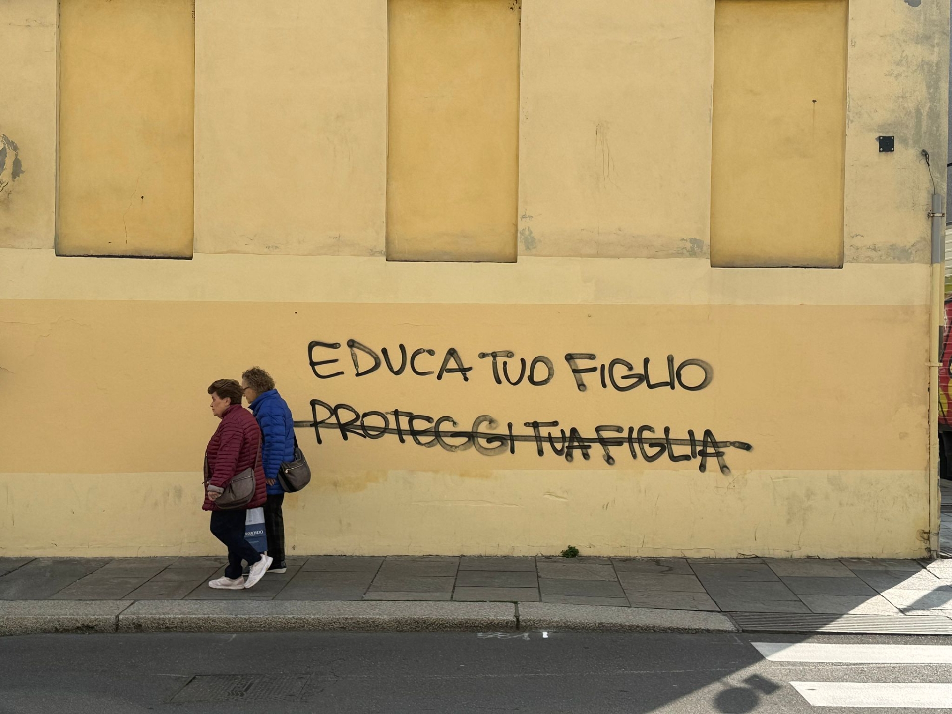 Per l’ennesima volta è spuntata una scritta sul muro giallo dell’edificio affacciato su via Bixio, all’incrocio con via Umberto Benassi. Sulla parete si legge "Educa tuo figlio"; poco sotto compare "Proteggi tua figlia", successivamente cancellata con una linea nera.
