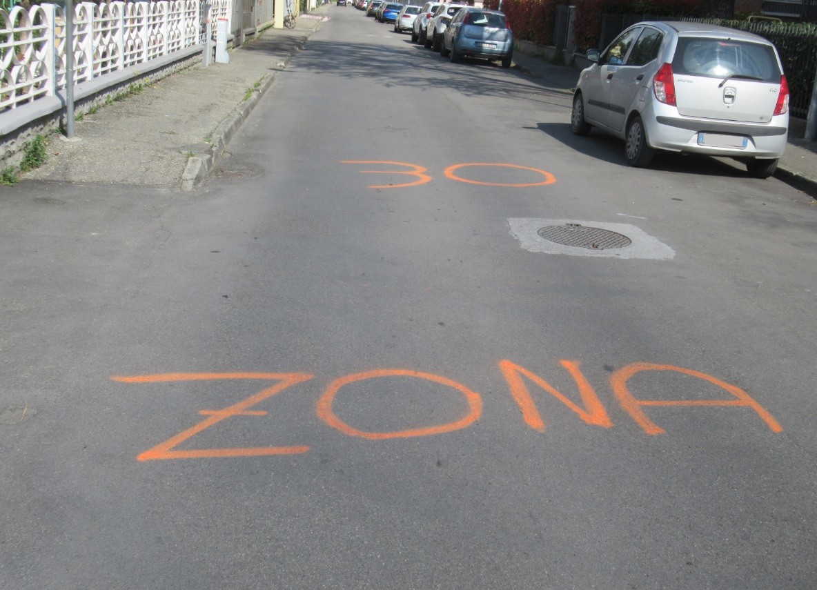 La «cartellonistica» ufficiale non è sufficiente a far capire a tutti gli automobilisti che in via Del Bono (zona Lubiana e anche «zona 30») il limite di velocità è di 30 chilometri all’ora? Fatto sta che a metà della strada rettilinea e a senso unico che unisce via Casa Bianca a via Emilio Lepido è comparsa una "segnaletica fai da te": una scritta arancione in terra. Ha poco di «ufficiale» però ricorda a chi la percorre in auto o in moto che c’è il limite «30» da rispettare.