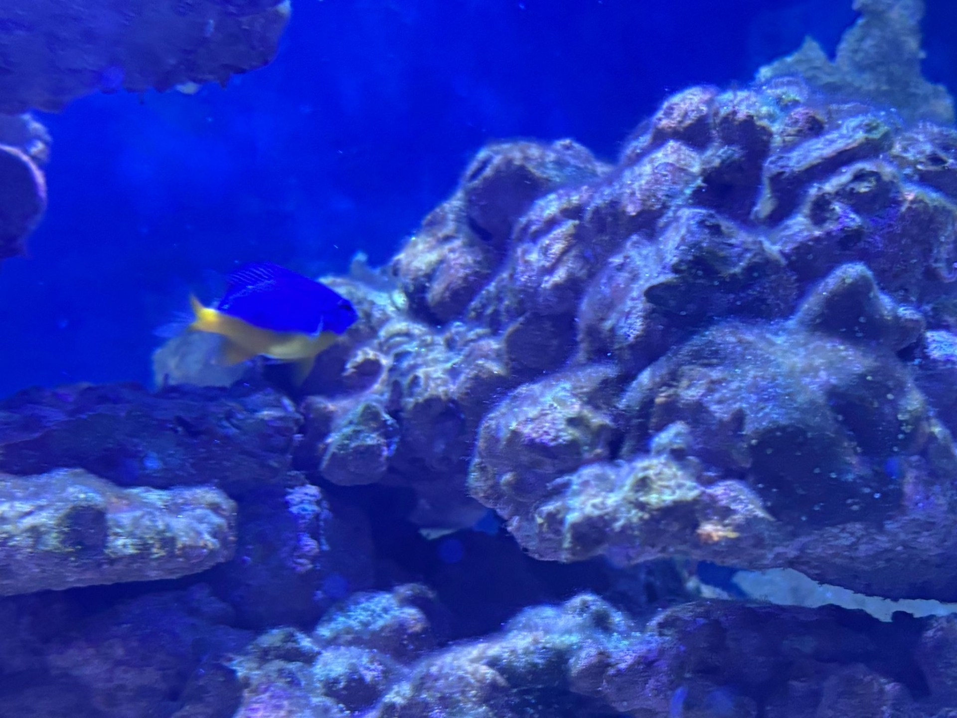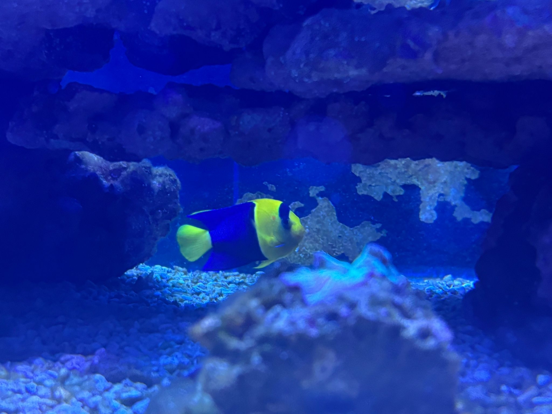 Si tratta di un pesce angelo bicolore (Centropyge bicolor), una specie marina diffusa nell'Indo-Pacifico, caratterizzata da una colorazione gialla e blu.