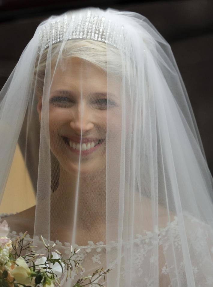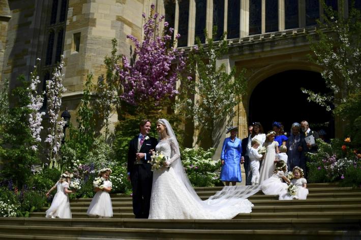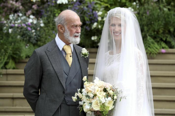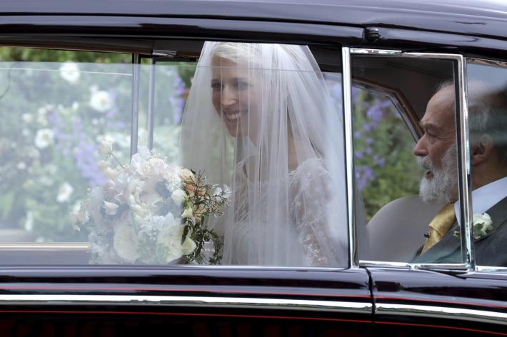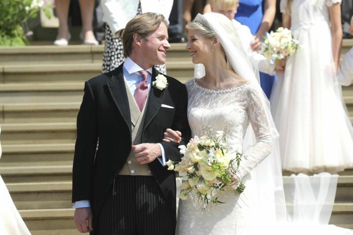 Terzo matrimonio reale in meno un anno al castello di Windsor. Dopo quello epico di Harry e Meghan - che domani festeggiano il loro primo anniversario -, le nozze più dimesse della cugina Eugenie, oggi è stata la volta di Lady Gabriella Windsor. La figlia del principe Michael del Kent, cugino della regina Elisabetta, si è sposata con Thomas Kingston, ex fidanzato di Pippa Middleton, in un abito della stilista italiana Luisa Beccaria. In pizzo rebrodè e organza, l'abito romantico era abbellito da un velo di sei metri, anch’esso creato dalla designer milanese, tenuto da una tiara di diamanti, già appartenuta alla nonna della sposa, la duchessa Marina.