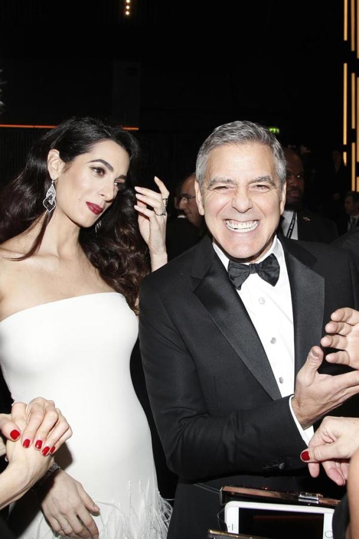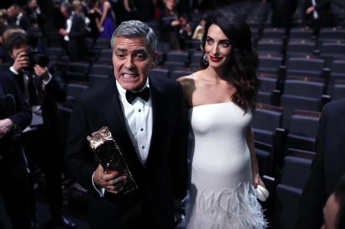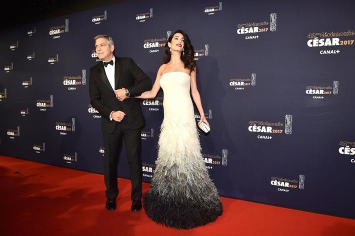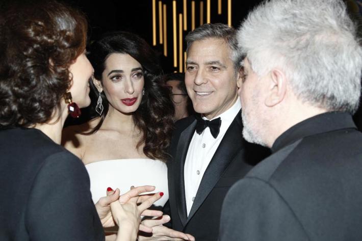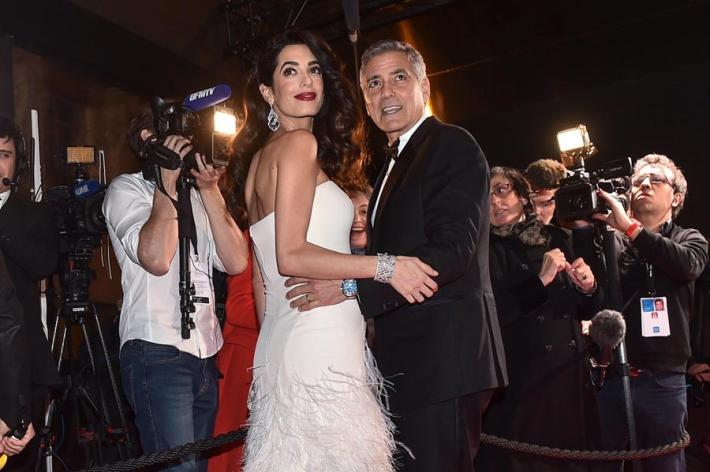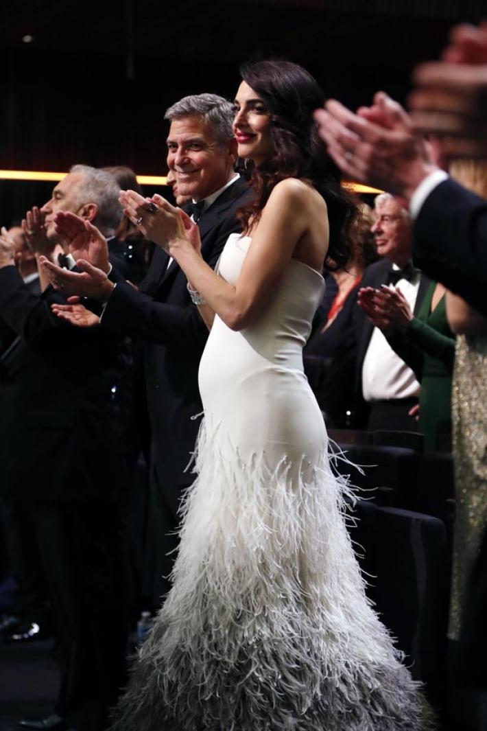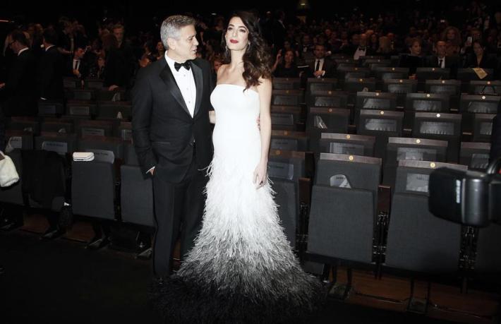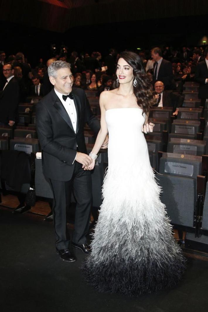 Prime immagini di Amal Alamuddin con il pancione (due gemellini in arrivo). I piccoli nasceranno a fine primavera. Con lei Geroge Clooney.  Amal si è presentata all'evento con un abito molto elegante di Versace: bianco, senza spalline, con inserti di piume.