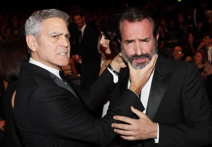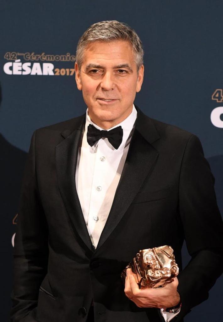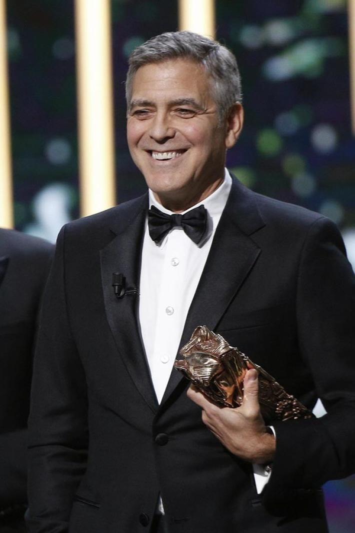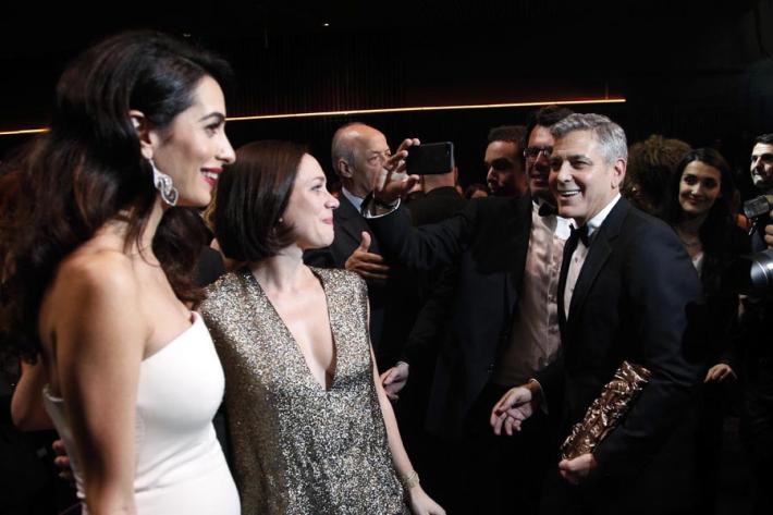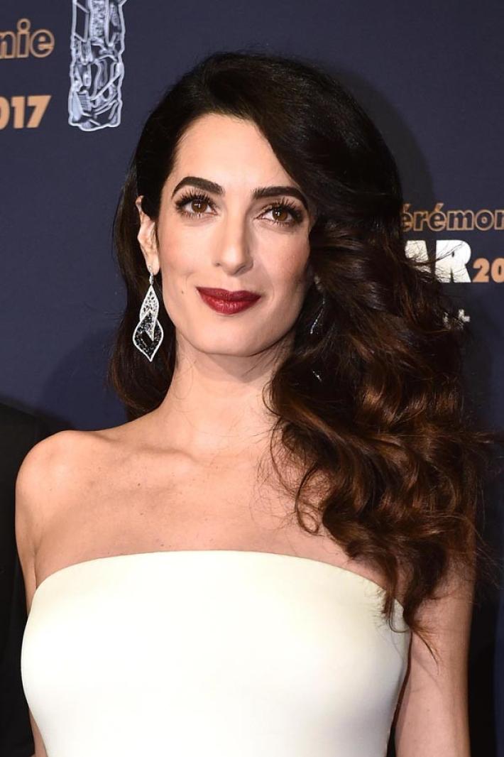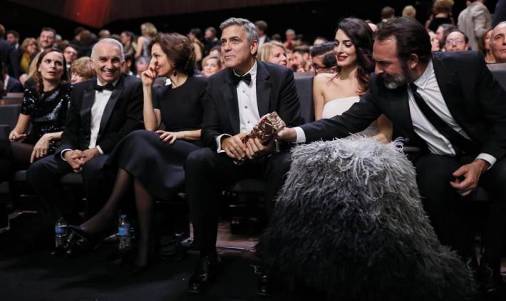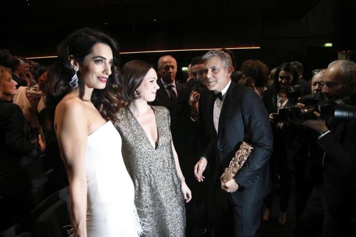 Prime immagini di Amal Alamuddin con il pancione (due gemellini in arrivo). I piccoli nasceranno a fine primavera. Con lei Geroge Clooney.  Amal si è presentata all'evento con un abito molto elegante di Versace: bianco, senza spalline, con inserti di piume.