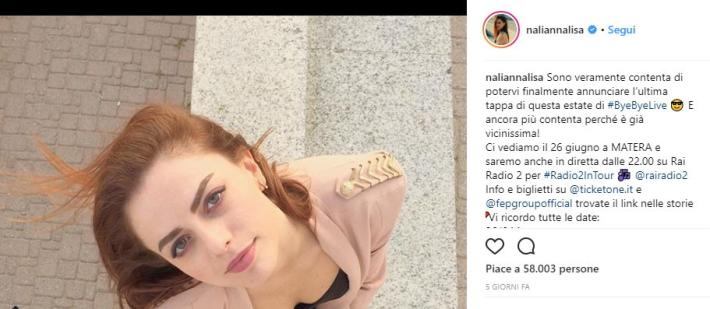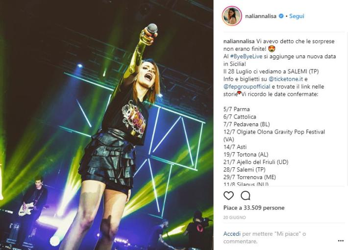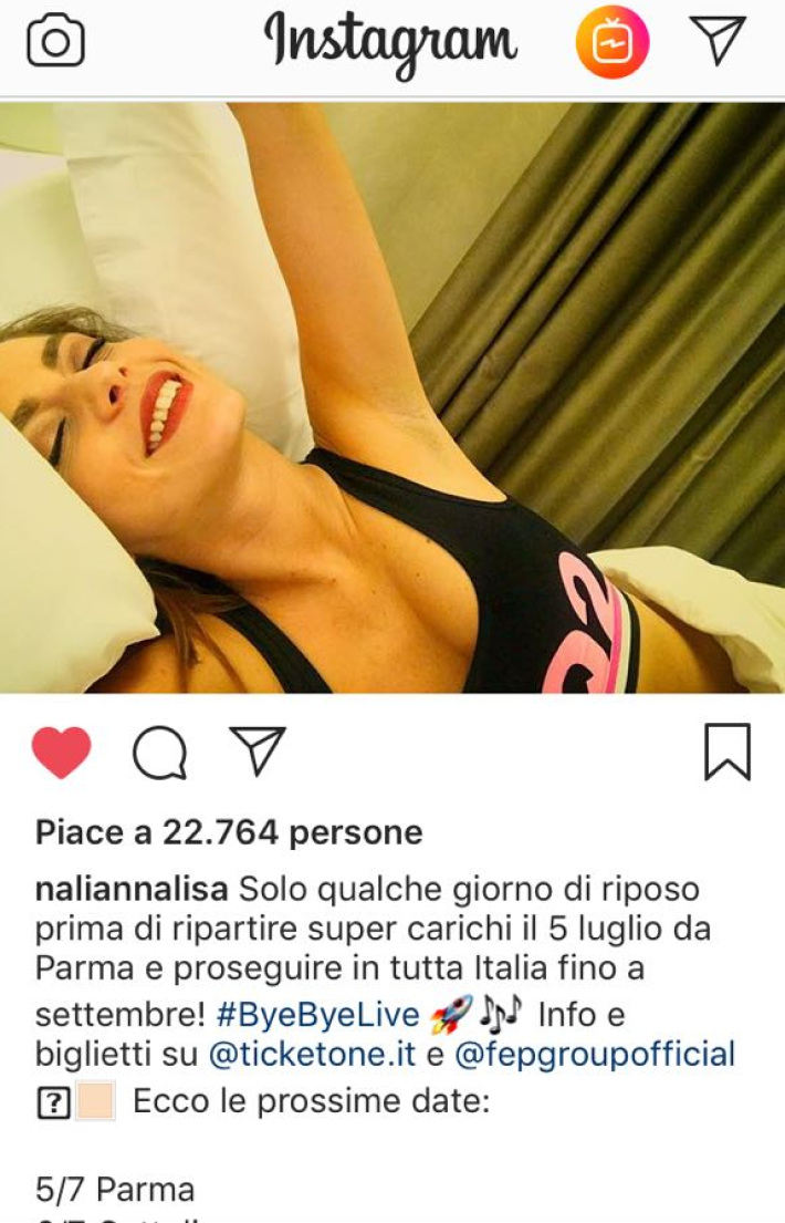 La cantante Annalisa si rilassa prima di approdare a Parma. Sul suo profilo Instagram, Annalisa ha pubblicato una foto commentando: "Solo qualche giorno di riposo prima di ripartire super carichi il 5 luglio da Parma e proseguire in tutta Italia fino a settembre! #ByeByeLive".