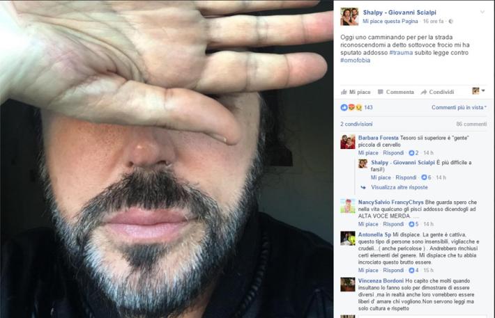 Ciò che gli è successo camminando per Roma lo ha raccontato lui stesso sui social network. "Un uomo incrociato per la strada, riconoscendomi, ha detto sottovoce "frocio" e mi ha sputato addosso. Un trauma". E un appello: "Subito la legge contro l'omofobia".