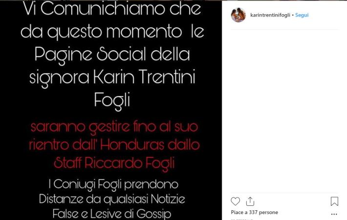 Con la partecipazione al programma tv, comunque, pare che la coppia avesse messo in conto la possibilità di gossip di qualche tipo. In un post del 20 febbraio sul profilo di Karen Trentini, nell'immagine si legge: "Vi comunichiamo che da questo momento le pagine social della signora Karen Trentini Fogli saranno gestite fino al suo rientro dall'Honduras dallo Staff Riccardo Fogli. I coniugi Fogli prendono le distanze da qualsiasi notizie false e lesive di gossip".