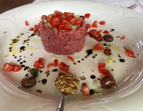 Battuta al coltello nel filetto di manzo: per condimento pomodorini, olive verdi e un cucchiaino di senape in grani