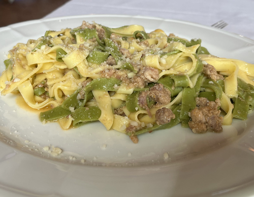 Tagliatelle bianche e verdi, di buona pasta all’uovo fatta in casa, morbide, dolci con un ragù di vitello e prosciutto