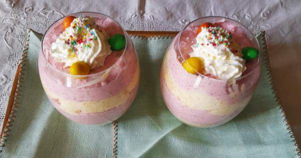 Partiamo frullando i due tipi di frutta separatamente con 50 gr di zucchero e il cucchiaio di liquore. Mettiamo in ammollo in acqua fredda, sempre separati, i 2+2 gr di colla di pesce. Scaldiamo il frullato di fragole e vi uniamo 2 gr di colla di pesce ben strizzata, facciamo altrettanto con il frullato di pesche. Dividiamo il mascarpone e lo incorporiamo nei due purè di frutta. Montiamo la panna e ne teniamo a parte 3 cucchiai per la decorazione. La rimanente la dividiamo nei due composti che porremo in frigorifero per una mezz’oretta. Ora passiamo all’assemblaggio riempiendo 8 bicchierini monoporzione alternando i due colori della frutta. Completiamo con ciuffetti di panna e tanti confettini e granella colorati.