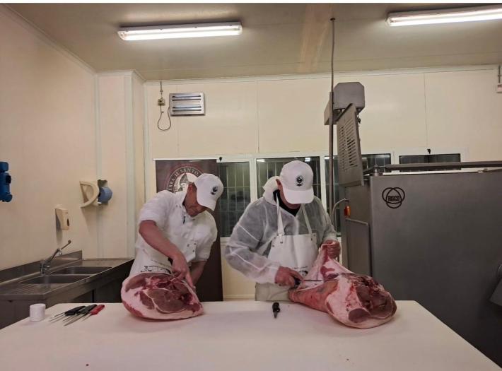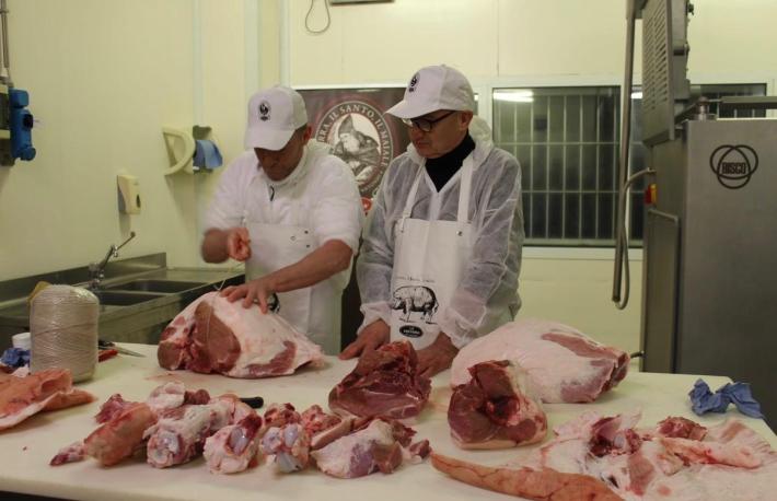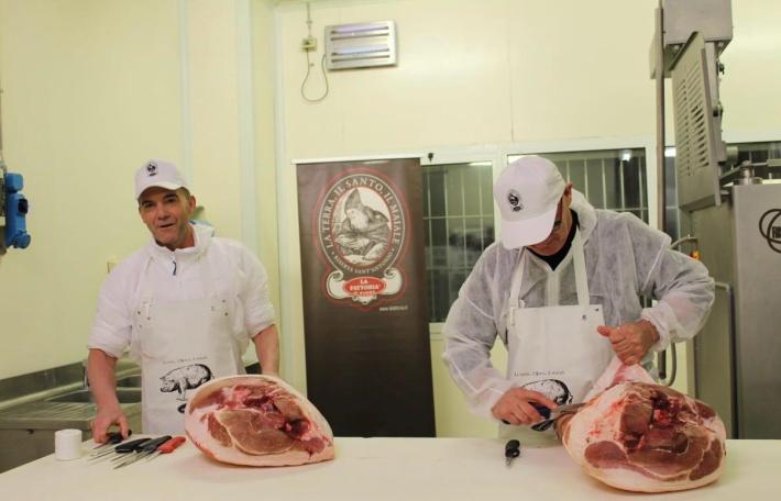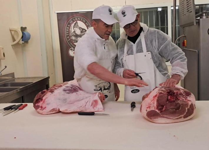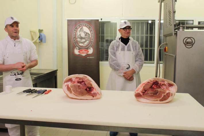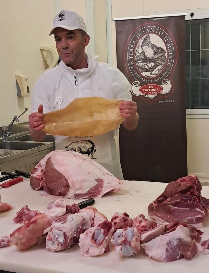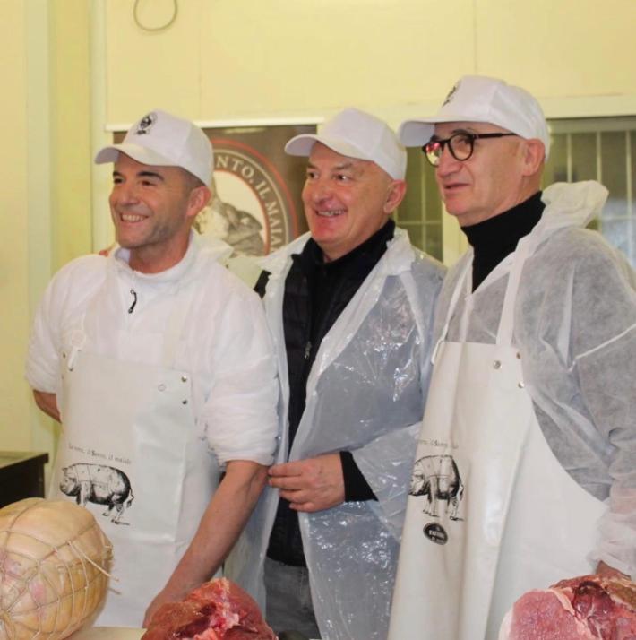 Il professore Enrico Vaienti, primario di Ortopedia e figura di spicco della medicina parmense, ha voluto infatti cimentarsi – "con sincera amicizia", sottolinea il titolare della Fattoria Paolo Pongolini – nello smontaggio di una coscia fresca per ricavarne il culatello, affiancato dal responsabile di produzione dell'azienda di Sanguinaro Matteo Orlandini.