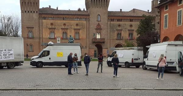 PAOLO PANNI BUSSETO Ambulanti in piazza ieri mattina a Busseto all’ombra della statua bronzea del maestro Verdi e della Rocca municipale. Per chiedere di tornare a lavorare. Da quando l’Emilia è tornata in...