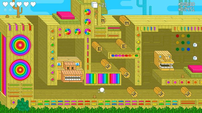 L’arte di creare un platform che sembra proprio un cartone animato interattivo, nello stile della coloratissima opera grafica di Jesse Jacobs. Spinch, realizzato con la collaborazione della software house Queen bee, assomiglia a un inarrestabile viaggio virato nelle tinte vivaci di un paesaggio psichedelico, dove si generano di continuo nuove composizioni di forme geometriche, esteticamente ben equilibrate, in un progredire di sequenze in pixel art che possono rivelarsi molto complicate, ma consentono in ogni caso anche un approccio a misura di chi preferisce ritmi più tranquilli. Del resto gli autori non hanno volutamente previsto l’eventualità del game over: si ricomincia sempre, catturati dalla varietà di combinazioni che danno vita ad ambientazioni liberamente ispirate alla campagna pianeggiante o alle distese ghiacciate della tundra. In questo gioco made in Canada la colonna sonora è del compositore di musica elettronica James Kirkpatrick (Thesis Sahib), che rende omaggio all’ormai remota era delle console degli anni ’80 rielaborando le sonorità vintage dei chiptune della stagione a 8-bit.
