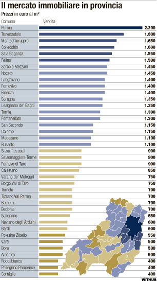 In provincia di Parma (che conta 450.923 abitanti) le città principali dal punto di vista immobiliare (con il maggior numero di immobili in vendita o in affitto) sono, dopo la città sono Fidenza, Salso, Traversetolo, Collecchio, Sorbolo Mezzani, Langhirano, Medesano, Montechiarugolo.