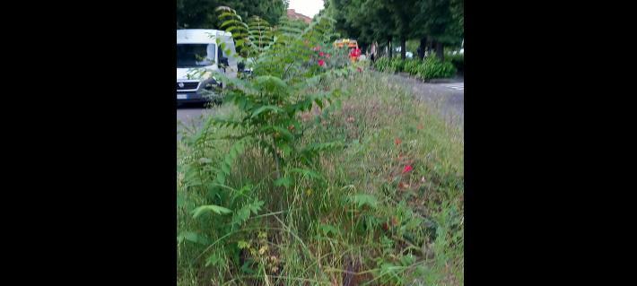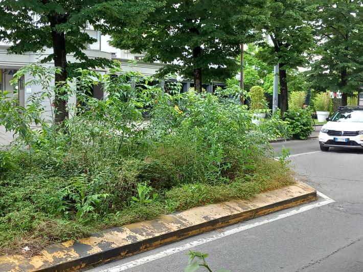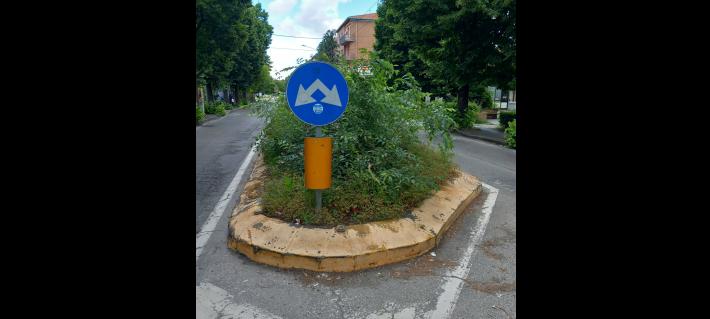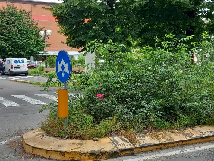 Erba ed arbusti ormai ad altezza uomo impediscono la visuale ad autovetture e soprattutto a pedoni, con evidente pericolo di collisioni ed investimenti di persone.