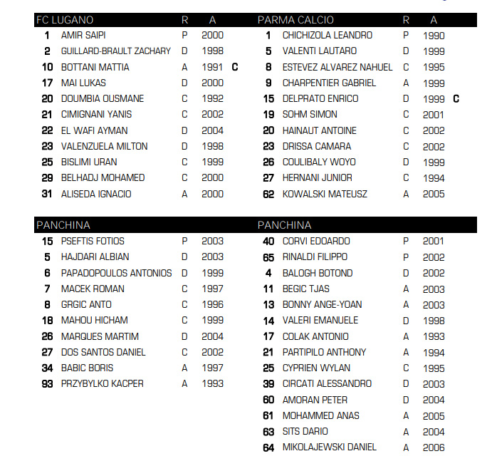 Infatti non solo il 20 debuttano nella nuova stagione della Serie A svizzera, ma il 23 hanno anche il turno preliminare di Champions con il Fenerbahçe. Il Lugano, secondo in campionato l'anno scorso è squadra che punta al titolo. Il Parma, però, non sta a guardare e al 5' Kowalski fugge in velocità verso la porta. Botta a colpo sicuro, Saipi respinge, sulla palla si avventa Charpentier ma l'attaccante crociato viene anticipato da un difensore.
