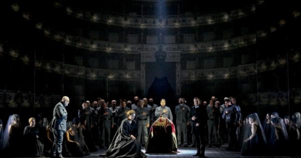 L’allestimento firmato da Pierre Audi, con le scene di Michele Taborelli, i costumi di Robby Duiveman, le belle luci di Jean Kalman e Marco Filibeck e le coreografie di Pim Veulings dà una lettura asciutta di «Macbeth», ispirandosi al teatro greco e a quello barocco. Proprio sullo sfondo di un teatro (una riproduzione dello stesso Regio di Parma) si aprono le scene, con sipari, quinte e poltroncine a fare da padroni nei primi due atti. Non un’idea nuova, quella di mettere il teatro allo specchio (viene in mente, per esempio, il «Don Giovanni» di Robert Carsen, in cui un vero specchio riflette il pubblico in platea e nei palchi). L’aspetto forse più interessante di questa regia è il suo scardinare la separazione tra scene (come Verdi stesso tende a fare) concatenandole l’una all’altra, facendo entrare i personaggi prima del tempo (Lady Macbeth fa il suo ingresso tra le streghe, Macbeth recita la propria lettera alla moglie…) in un incalzare drammaturgico e musicale. Una botola sul pavimento del palcoscenico diventa punto di passaggio tra morte e vita, tra inferi e terra. Ne fanno uso, non a caso, Macbeth e Lady Macbeth, la bara del re morto, i sicari, le streghe… Completo cambio di scena per terzo e quarto atto in cui il teatro si dissolve per lasciare scoperti i nervi di due personaggi inermi davanti al proprio destino, imprigionati dalle loro stesse inferriate.