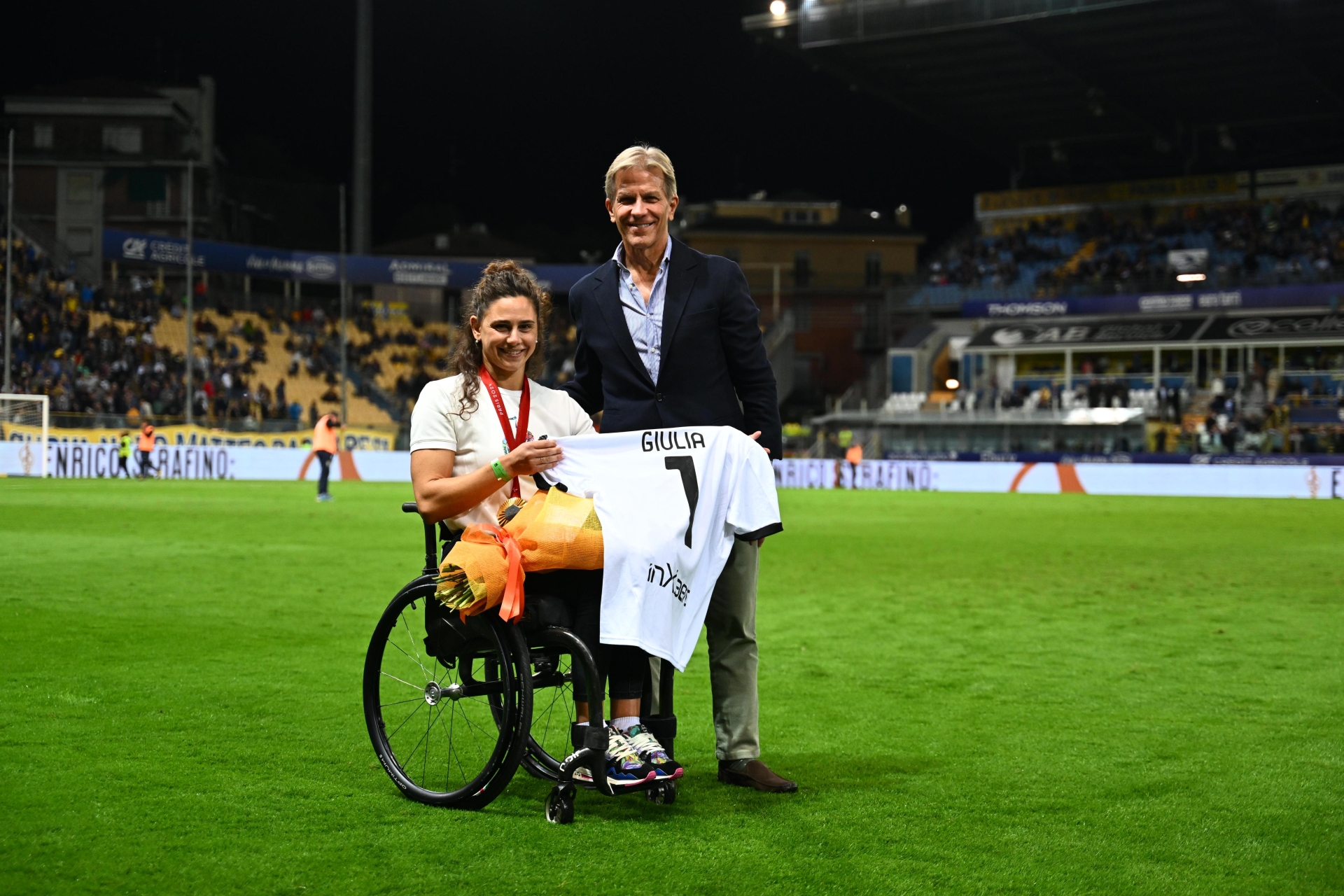 Prima del match il Parma calcio ha premiato la camponessa parmigiana di nuovo paralimpico Giulia Ghiretti