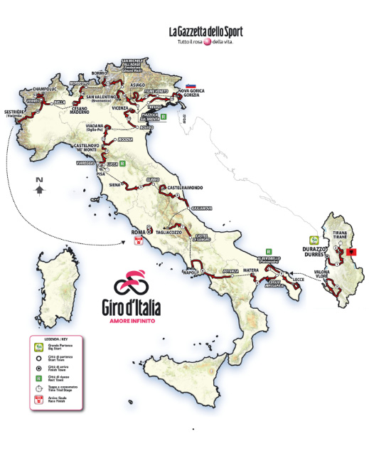 La 108/a edizione del Giro d’Italia, in programma dal 9 maggio al 1 giugno, per la quindicesima volta nella sua storia, partirà dall’estero. Al via dunque con tre tappe inedite in Albania, di cui una crono, fino ad arrivare al «Grande Arrivo» a Roma, per un tracciato totale di 3413 km con 52.500 metri di dislivello. Due saranno le prove a cronometro individuale, sei le tappe per velocisti, otto di media montagna e cinque di alta montagna. Circa trentotto, invece, i chilometri di sterrato, trenta di strade bianche nel finale della tappa di Siena e otto sul Colle delle Finestre che sarà anche La 'Cima Coppì con i suoi 2.178 metri.