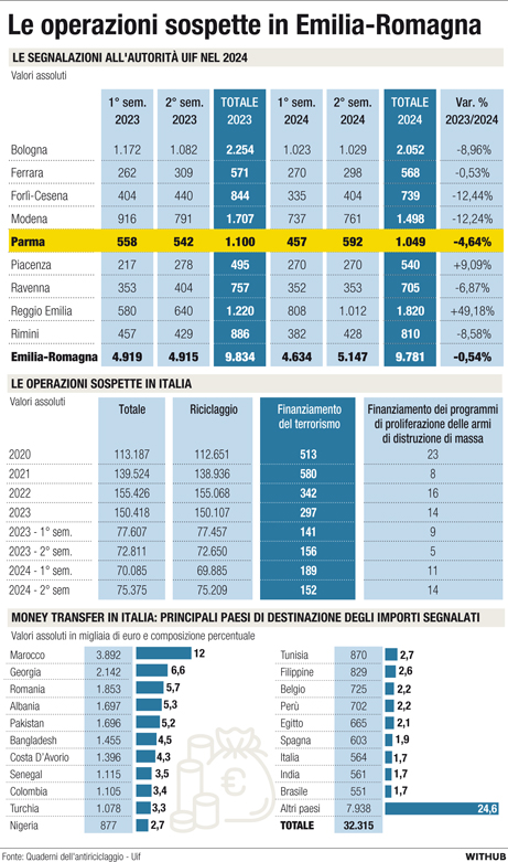 In Emilia-Romagna, Reggio va decisamente in controtendenza. I dati raccontano una situazione pressoché stabile in regione: 9.781 Sos nel 2024, lo 0,54% meno dell’anno prima. Anche qui con il (già citato) rialzo degli ultimi mesi. Vale anche per Parma, che passa dalle 1.100 segnalazioni alla Uif del 2023 alle 1.049 del 2024. Un calo del 4,64% ma con un’evidente differenza fra i semestri: 457 Sos nel primo - proseguendo un rallentamento iniziato un anno prima - e 592 nel secondo. Un dato semestrale record, per Parma, negli ultimi anni. In termini assoluti è Bologna ad avere il «paniere» di segnalazioni più corposo: 2.052 nel 2024, con un calo di 8,96%. In percentuale, Rimini ha un trend simile: -8,58% ma «solo» 810 Sos. Non passano inosservate Modena (1.498 segnalazioni, -12,24%) e Forlì-Cesena (739, -12,44%). Altri cali delle Sos: Ravenna -6,87%, Ferrara -0,53%.