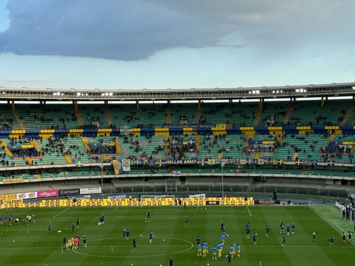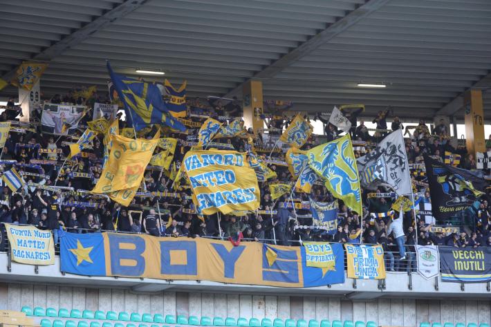 Hellas Verona-Parma, calcio di inizio alle 18,30 al Bentegodi. Il presidente Krause è seduto in tribuna, quasi 1.400 tifosi crociati nel settore Ospiti.