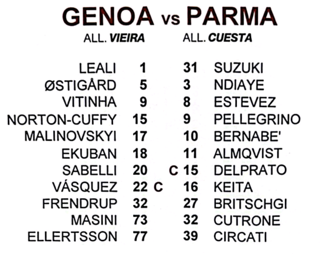Riprende il campionato dopo la felice pausa per la nazionale. Per il Parma, impegnato in trasferta a Genova, è senza mezzi termini un match da coltello tra i denti. Il Genoa è ultimo e deve risollevarsi dalla crisi, i crociati sono appena sopra la zona "inferno" e, per non sprofondare, i punti li deve fare. Non ci sono alternative, il Genoa promette battaglia. E il Parma, con Estevez dal 1' promette di non tirarsi certo indietro.