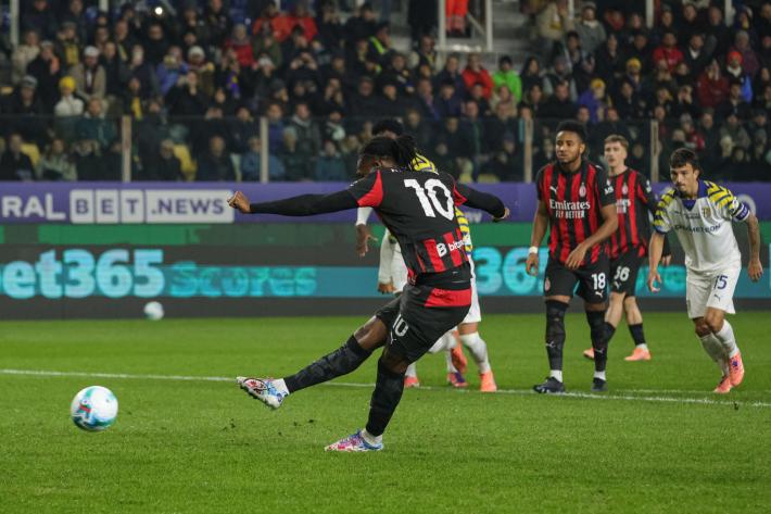 25' L'arbitro conferma: è rigore per il Milan. Suzuki intuisce la traiettoria del pallone ma non riesce a fermarlo: Leao segna il gol del vantaggio per 2-0 dei rossoneri