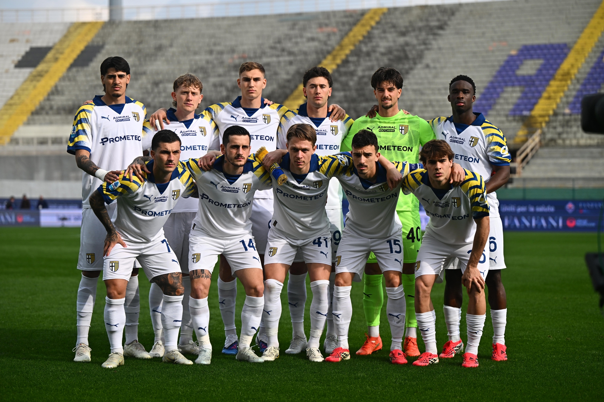 Parma con un 4-3-3. Terza maglia, bianca, con le sfumature gialloblù sulle maniche