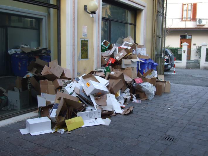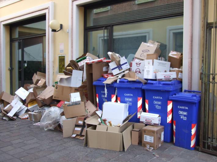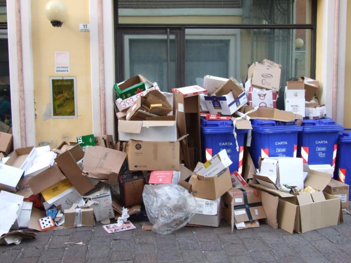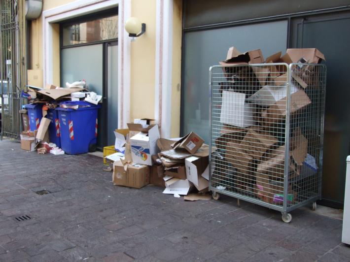 Una lettrice ci segnala, dalla Galleria santa Croce in via Gramsci: i cartoni non vengono ritirati da più di una settimana, nonostante numerose chiamate al numero verde e invio di email a Iren. Non si riesce a sapere il numero di telefono del responsabile della raccolta e al numero verde rispondono che non sanno cosa farci. Oggi è venerdì e in Galleria ci sono ristoranti e pizzerie, oltre ad uffici e negozi di altro genere con la conseguente pessima immagine del centro commerciale e la possibilità di rischio incendi e topi.