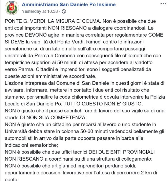 "La misura è colma. Non è possibile che le Province di Parma e Cremona non riescano a dialogare" per gestire la viabilità del Ponte Verdi. Lo dice un intervento su Facebook della pagina Amministriamo San Daniele Po Insieme, con cui l'amministrazione comunale del paese del Cremonese denuncia le tempistiche "superiori ai 50 minuti di attesa" per poter passare il ponte Verdi da e per Ragazzola. Il post lamenta anche che la polizia locale del paese lombardo ieri è stata impegnata per gestire problemi su una strada che non è di competenza comunale.