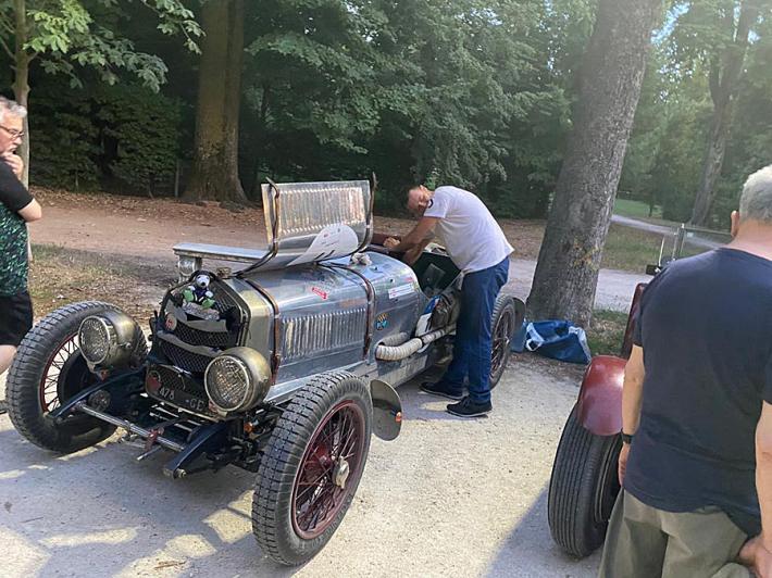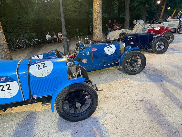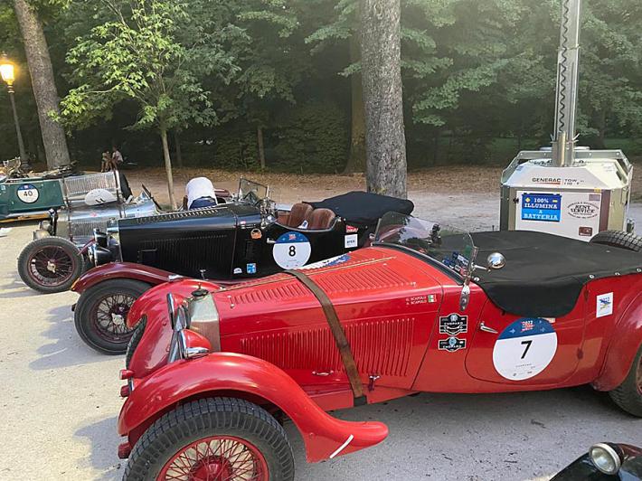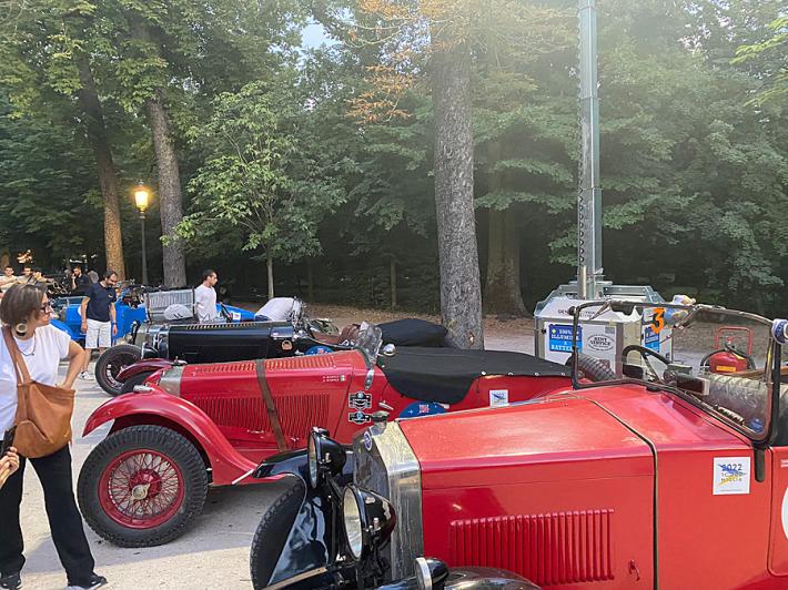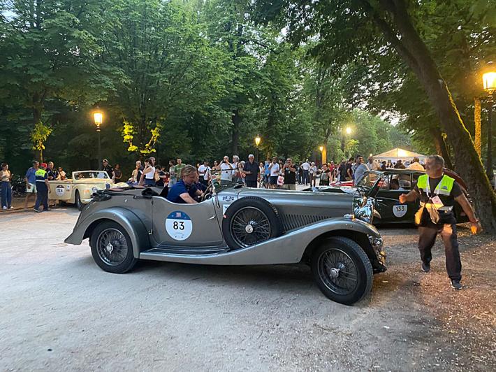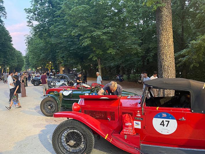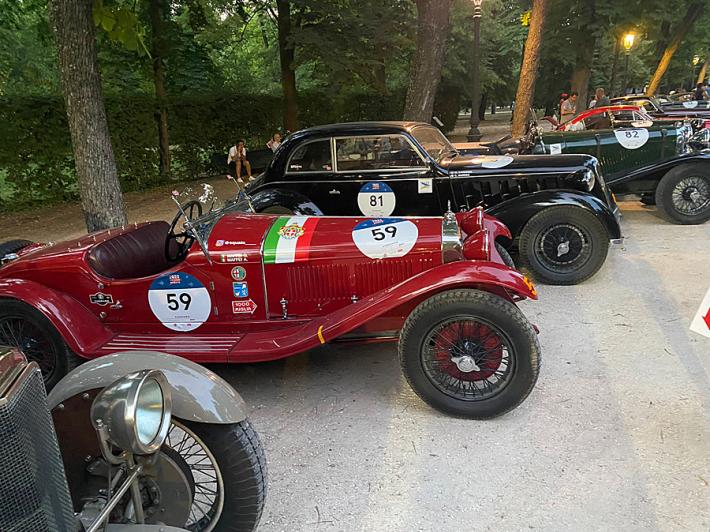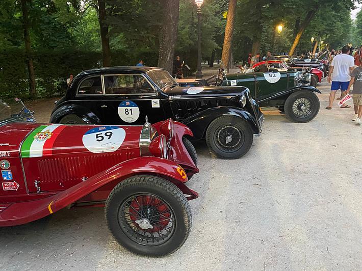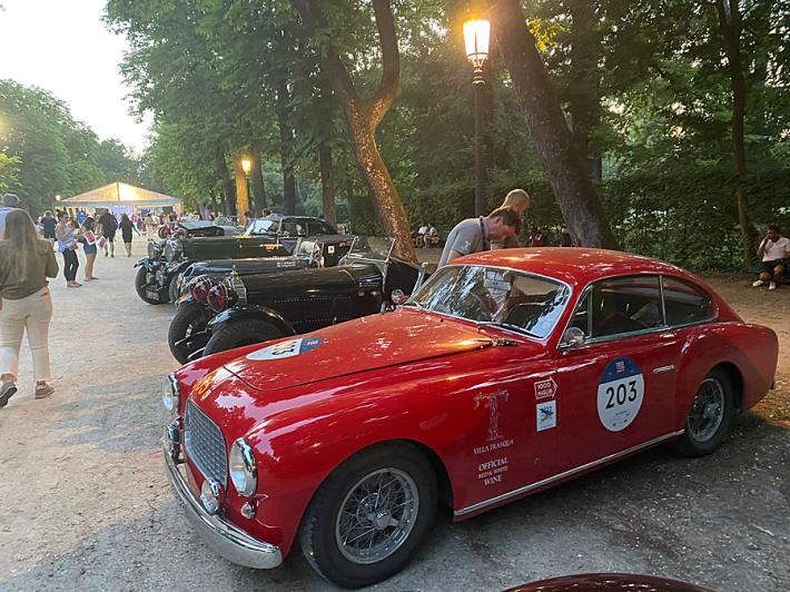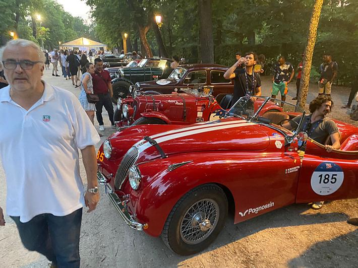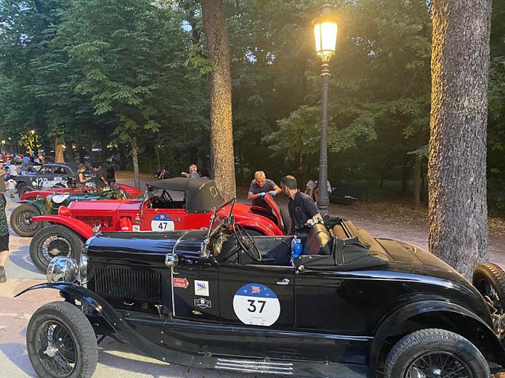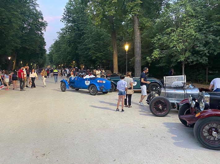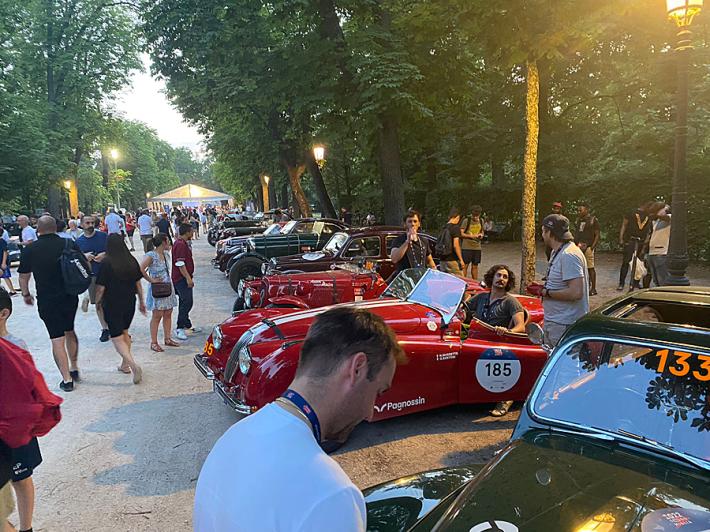 Dopo la sfilata in città, le auto delle Mille Miglia sono "parcheggiate" al parco Ducale, dove staranno tutta la notte.