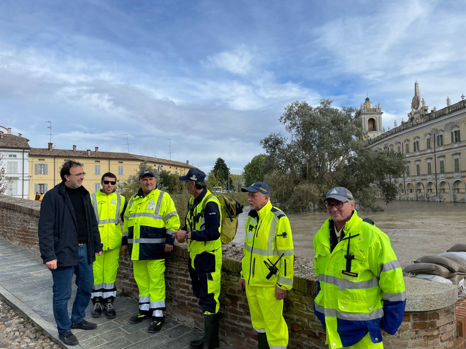 Colorno, sta passando la piena proprio in questi istanti: un fiume impetuoso sotto la Reggia. Uomini della Protezione Civile e del Comune presidiano il territorio.