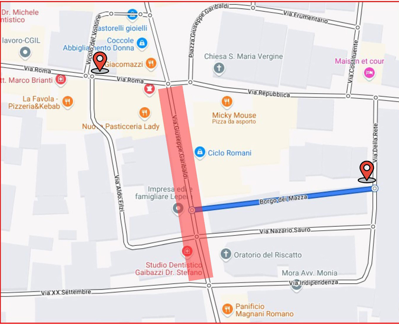 Da oggi, lunedì 31 marzo, con l’avvio dei lavori di riqualificazione di via Garibaldi, ci sono modifiche alla viabilità nel centro di San Secondo. I lavori riguardano il tratto compreso tra l’intersezione con via XX Settembre/via Indipendenza fino all’intersezione con piazza Garibaldi, via Roma e via Repubblica. L’intervento prevede la riqualificazione della pavimentazione in cubetti di porfido e pietra ed il riordino dei sottoservizi e avrà una durata di circa 4 mesi. Durante la permanenza del cantiere, nel tratto di via Garibaldi interessato dai lavori sarà consentito il transito pedonale e ciclabile, e garantito l’accesso alle abitazioni e alle attività commerciali tramite passerelle; sarà invece vietato il traffico veicolare. Nelle vie Borgo dei Mazza, Nazario Sauro e Aldo Filzi sarà consentito il solo transito e la sosta ai residenti; non sarà consentito l’accesso su via Garibaldi e da via Indipendenza non sarà consentito l’accesso a via Garibaldi. L’accesso a Borgo della Rere sarà consentito solo ai residenti. Il servizio di raccolta di tutti i rifiuti delle utenze ubicate nel tratto di via Garibaldi interessato dai lavori, avverrà in Borgo della Rete e all’incrocio via Roma con via del Voltone. Inizialmente i lavori non interesseranno l’intersezione di via Garibaldi con via Indipendenza e via XX Settembre e ma saranno poi comunicate le ulteriori indicazioni e modifiche alla viabilità.