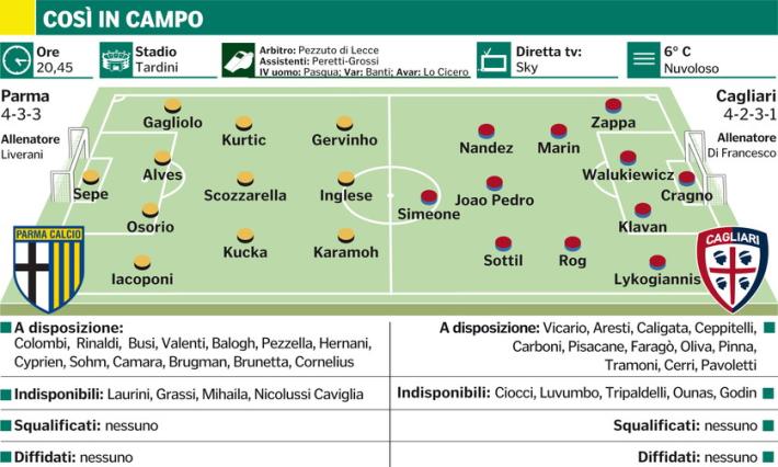 Intanto stasera ci sarà da venire a capo del Cagliari. probabilmente Di Francesco non farà le barricare ma a ben vedere non le ha fatte neppure il Benevento. Di questi tempi che arriva al Tardini senza velleità di alta classifica si limita a una difesa ordinata e a tempestivi raddoppi su Gervinho. Ultimamente però ic rociati stanno imparando a fare male anche con gli inserimenti dei centrocampisti e questa è una variabile importante in fase d'attacco. Oggi potrebbero rientrare Kucka e Scozzarella, elementi di esperienza anche quando c'è da trovare spazi tra le linee serrate degli avversari. In avanti potrebbe toccare a Inglese giocare dall'inizio. Nel Cagliari sono molto temibili gli esterni offensivi Nandez e Sottil, oltre ovviamente a Simeone e Joao Pedro, una coppia da 25-30 gol a stagione. In difesa invece i sardi hanno meno qualità e il Parma potrebbe cercare di approfittarne, magari trovando un po' di spazio per il giovane Brunetta.