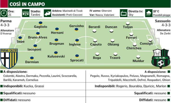 D'Aversa potrebbe anche pensare di dare un turno di riposo ad una delle due stelle crociate, con Cornelius (sempre positivo quando è entrato dalla panchina) pronto a giocare dal primo minuto al posto di Inglese e il giovane (figlio al prodigo) Karamoh pronto a debuttare al posto di Gervinho. Fantacalcio? Vedremo stasera. Più probabile il ballottaggio in cabina di regia tra Brugman ed uno Scozzarella ormai guarito e il ritorno tra i titolari di Gagliolo al posto di Pezzella. Decisioni non semplici e tanto meno scontate. Perché è vero che lunedì si torna in campo (sempre al Tardini, contro il Torino) ma è altrettanto vero che D'Aversa, con Kucka e Grassi ancora i box, può contare sempre su quei soliti venti giocatori (di cui tre sono portieri).