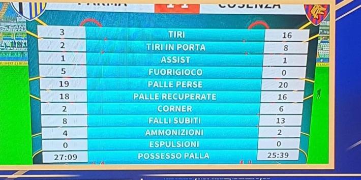 Il Parma chiude la frazione in calando mentre il Cosenza prende campo pur senza riuscire ad andare al tiro.
