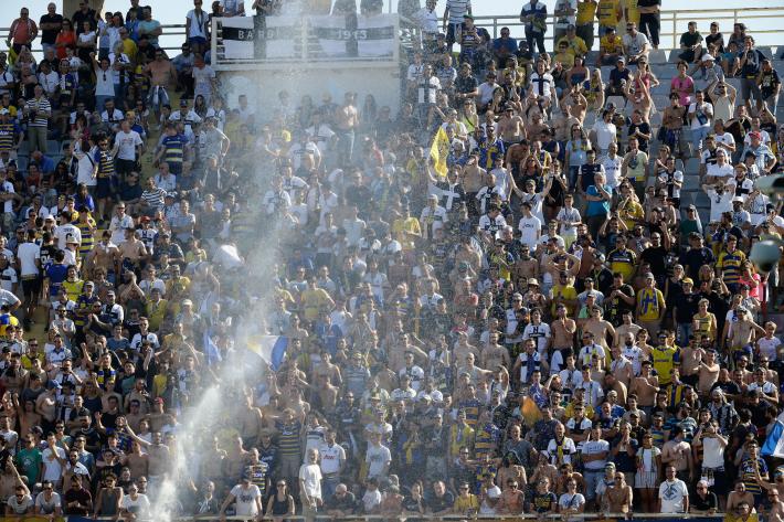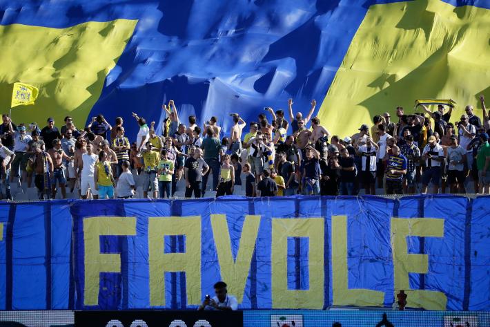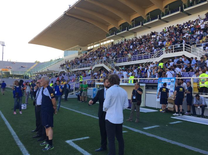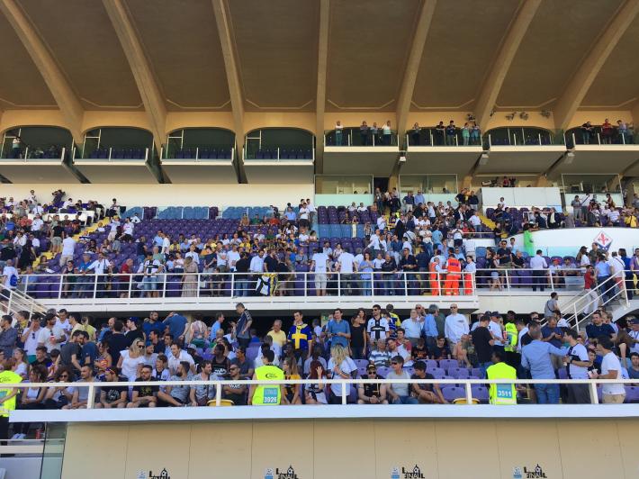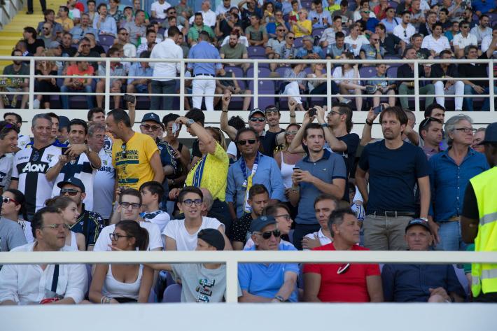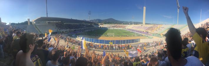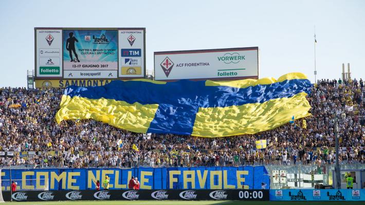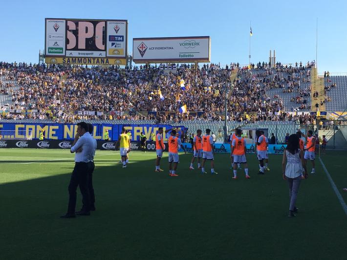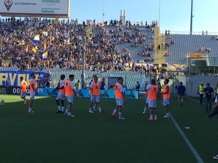 In palio c'è la Serie B. I tifosi crociati sono seimila: grande scenografia con l'enorme bandiera gialloblù che ricopre tutta la curva. C'è caldissimo, 35 gradi al Franchi