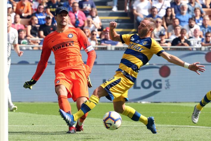 32' Doppio spunto del Parma che mette il naso nell'area dell'Inter. Gervinho scambia e si trova atu per tu con Handanovic che para