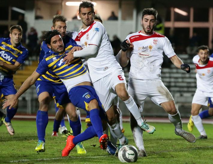 Il Parma, più deciso, guadagna metri ed è costantemente nella metà campo della Maceratese.