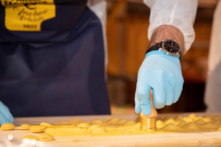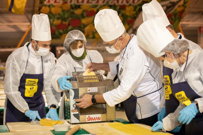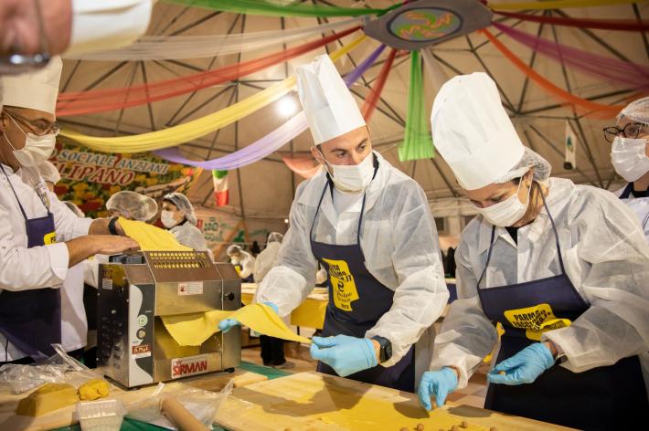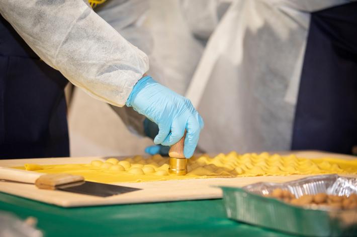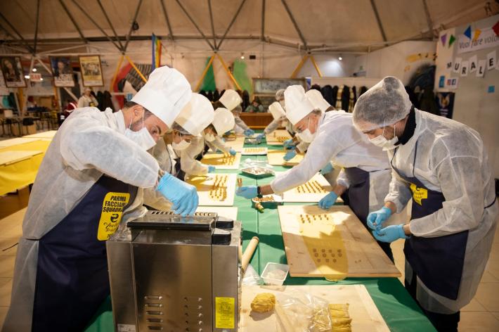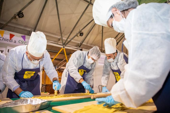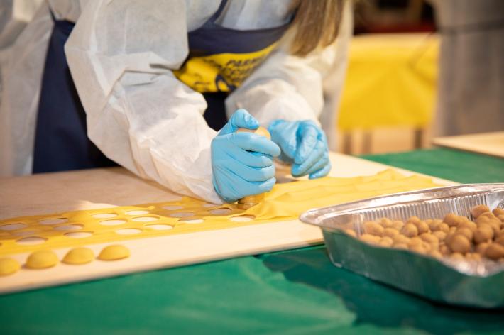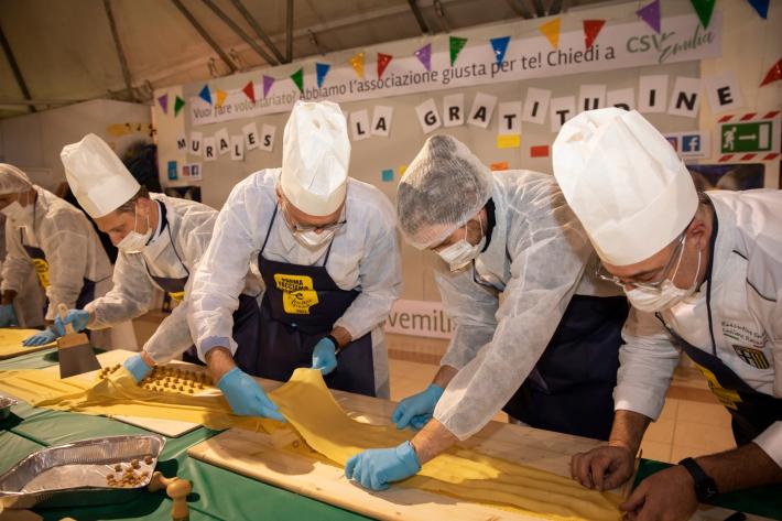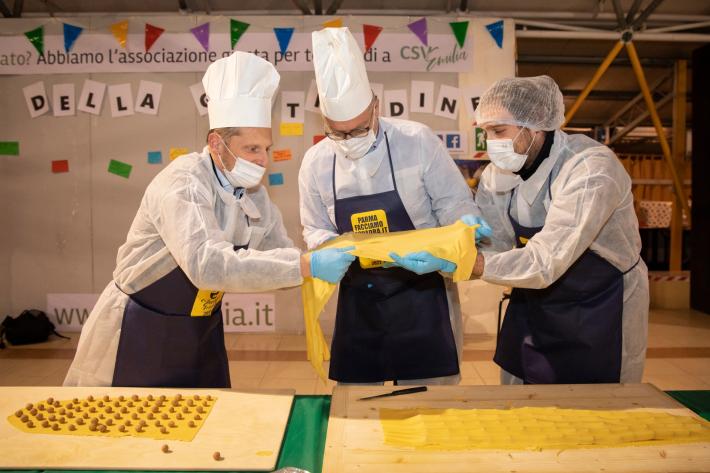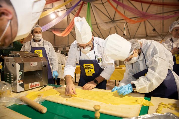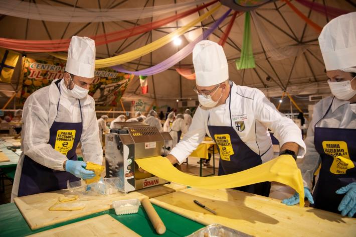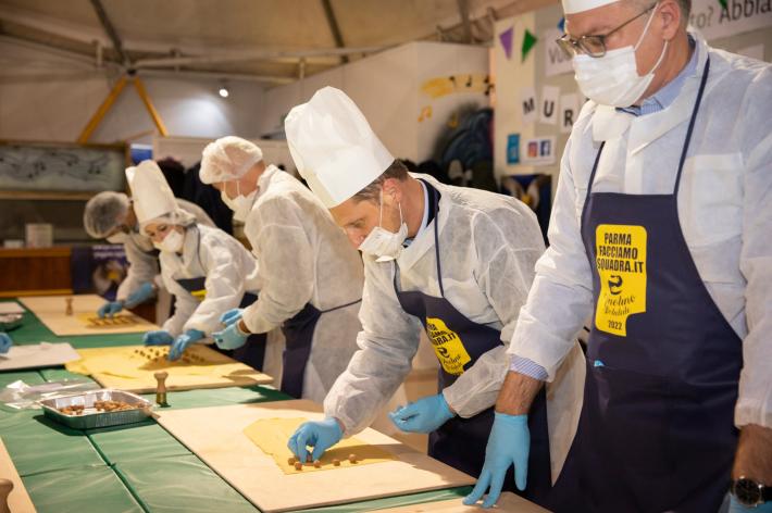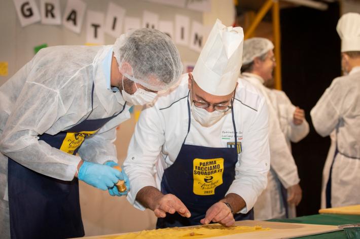 Anolini solidali con "Parma facciamo squadra", oggi al Centro Sociale il Tulipano di via Bonomi si sono cimentati nella preparazione di questa prelibatezza della nostra cucina i dirigenti del Parma calcio.