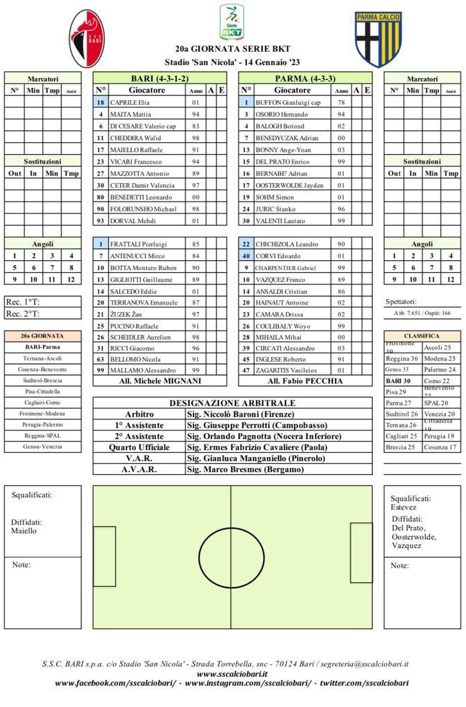 Le formazioni: Bari: Caprile Elia, Maita Mattia, De cesare Valerio (capitano), Cheddrra Walid, Maiello Raffaele, Vicari francesco, Mazzotta Antonio, Ceter Demir Valencia, Benedetti Leonardo, Folorunsho Michel, Dorval Medi
