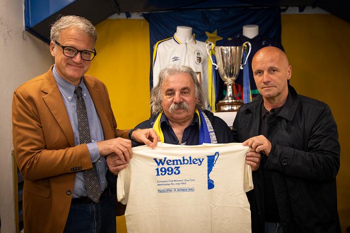 Il Museo del Parma «Ernesto Ceresini» ha portato ed esposto due cimeli di quella finale: le maglie di Tino Asprilla e Marco Ballotta, subito immortalate dagli smartphone di ultima generazione per un selfie da conservare nel cassetto dei ricordi più cari. Da brividi. La notte di Wembley vive e vivrà per sempre negli occhi di chi scese in campo contro i belgi dell'Anversa. Così come vive e vivrà in eterno nei cuori dei tifosi. Lo sa bene Angelo Manfredini. «Di quel 12 maggio 1993 ho tutto scolpito nella mente, in maniera nitida» osserva il leader del Centro di Coordinamento dei Parma Clubs. Che agli eroi di Wembley ha consegnato, a nome di tutti i tifosi presenti, una targa con una dedica speciale: «Le parole non bastavano per conquistare l'Europa, ma sudando e amando questa Maglia». «Gli applausi verso i nostri giocatori - ricorda Manfredini - cominciarono già prima del riscaldamento». E trent'anni dopo non sono ancora terminati...