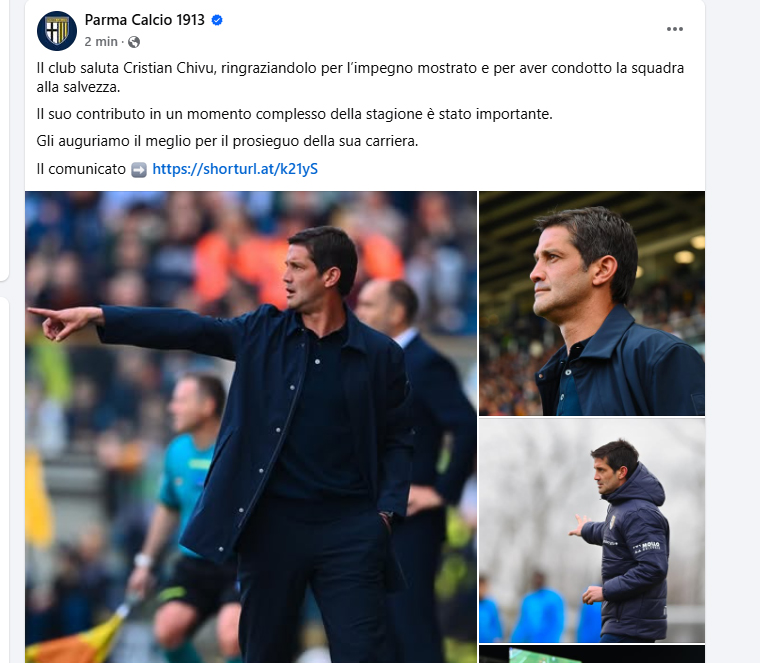 La giornata era iniziata con l’ex allenatore del Parma arrivato questa mattina in città per la risoluzione del contratto (video) e da un suo video sui profili social in cui ha voluto ringraziare la piazza gialloblù attraverso un messaggio sui social. Poche ore dopo è stato il club crociato che annunciava la rescissione consensuale ringrazianbdo il tecnico romeno: "Parma Calcio comunica di aver raggiunto l’accordo, in forma consensuale, con Cristian Chivu per la risoluzione del contratto. Il Club ringrazia Cristian per il lavoro svolto e per il raggiungimento dell’obiettivo sportivo, augurandogli le migliori fortune professionali per il prosieguo della carriera".