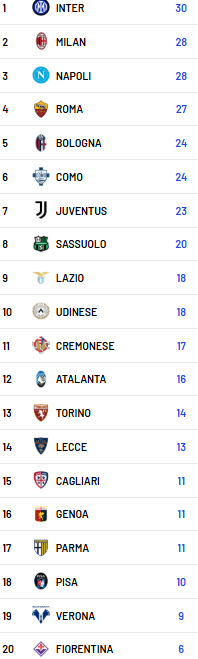 Nel momento migliore del Como, l’Inter colpisce. Sugli sviluppi di un corner di Dimarco, Thuram attacca il primo palo e gira di sinistro anticipando Butez. C'è anche la chance del 3-0, ma Lautaro su assist di Luis Henrique spreca un rigore in movimento. Il tris è rimandato all’81': Barella strappa via un pallone sulla trequarti, l’azione si sviluppa con Lautaro e Mkhitaryan, ma il destro vincente da fuori area è di Calhanoglu. All’86' il poker con un’azione classica da quinto a quinto: Dimarco crossa dalla sinistra, Carlos Augusto indovina il rimbalzo e trova una gran conclusione che si infila in rete. Uno stop pesante per il Como, che non perdeva dal 30 agosto e che nel prossimo turno sfiderà la Roma. Per l’Inter invece ci sarà l’ostacolo Genoa.