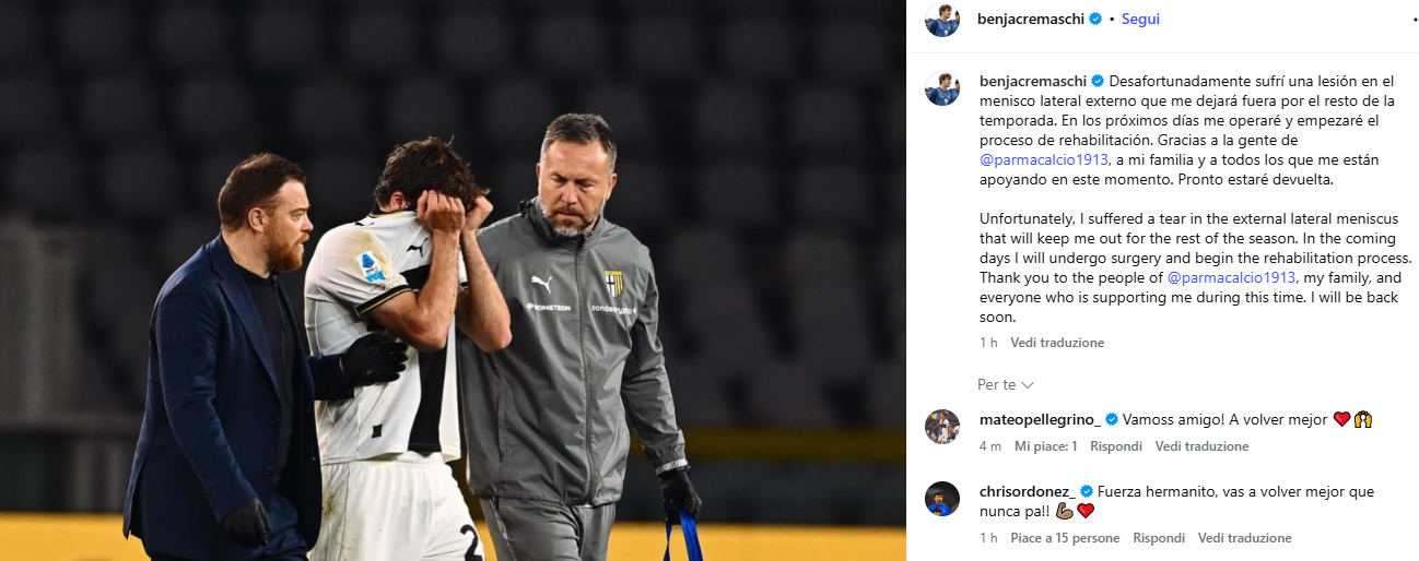 Sui social poco fa il giocatore crociato ha pubblicato un post dove ha spiegato l'infortunio, annunciando anche l'operazione al menisco. Ha inoltre ringraziato i tifosi crociati e tutto lo staff per gli auguri di pronta guarigione. Qui le parole di Benjamin Cremaschi: "Purtroppo ho subito uno strappo al menisco laterale esterno che mi terrà fuori per il resto della stagione. Nei prossimi giorni mi sottoporrò ad un intervento chirurgico e inizierò il mio percorso di riabilitazione. Grazie alle persone del Parma Calcio, alla mia famiglia e a tutti coloro che mi sostengono in questo periodo. Tornerò presto." Subito le risposte affettuose e "grintose" dei compagni, in primis Pellegrino e Ordonez.