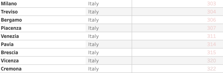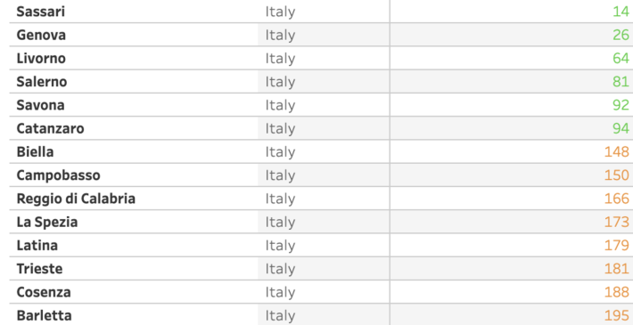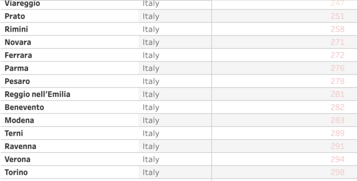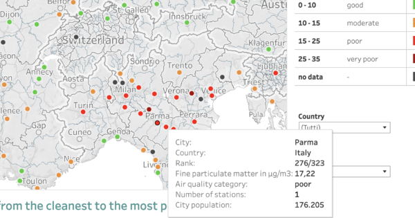 Cremona e Vicenza sono tra le cinque città europee con i più alti livelli di inquinamento da particolato sottile (PM2.5). I dati, che si riferiscono a una media tra emissioni certificate dalle centraline Ue nel 2019 e stime 2020, emergono dalla consultazione del nuovo visualizzatore della qualità dell'aria delle città europee varato dall'Agenzia europea dell'ambiente (Eea). Ultima per la qualità dell'aria è Nowy Sacz (Polonia), al 323esimo posto. Cremona è al 322, Slavonski Brod (Croazia) al 321esimo e Vicenza al 320esimo. Sassari è la città italiana che si piazza meglio, al 14esimo posto. Parma è al 276° posto.