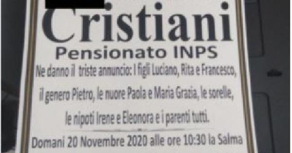 Per l'86enne la positività al Covid e' stata accertata il 6 novembre scorso quando e' esploso il focolaio all'interno della Fondazione Palena dove sono stati contagiati tutti i 69 ospiti e 28 operatori sanitari. Struttura poi commissariata dalla Asl di Foggia che ha affidato la gestione al gruppo Universo Salute. Visto l'aggravarsi delle sue condizioni, Cristiani era stato trasferito all'ospedale foggiano.
