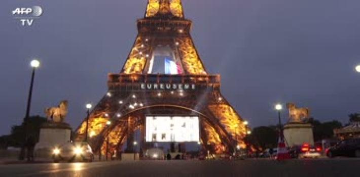 Sul simbolo di Parigi un maxischermo con i volti degli 'eroi' durante l'emergenza